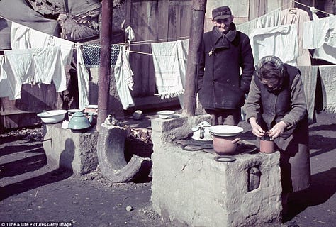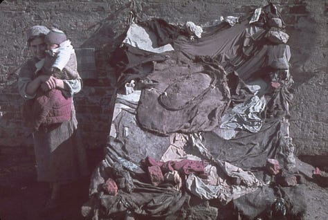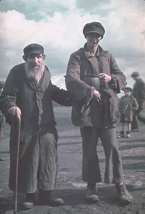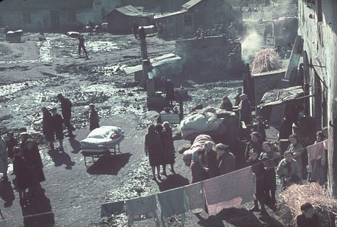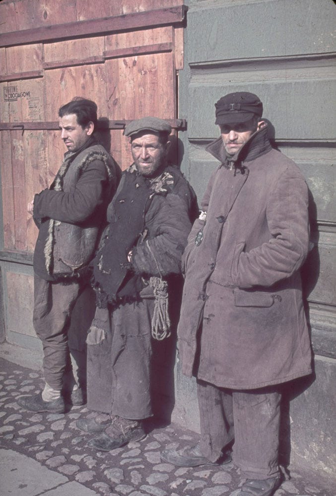 The photos from the Hugo Jaeger Collection (one of Hitler’s personal photographers) show Jews living with no sanitation or working sewers, with human fecal matter dumped in the open along with other bodily wastes and overflowing drains, and all of the Jews are in tattered clothing, living in makeshift tents made of old carpets and clothes.