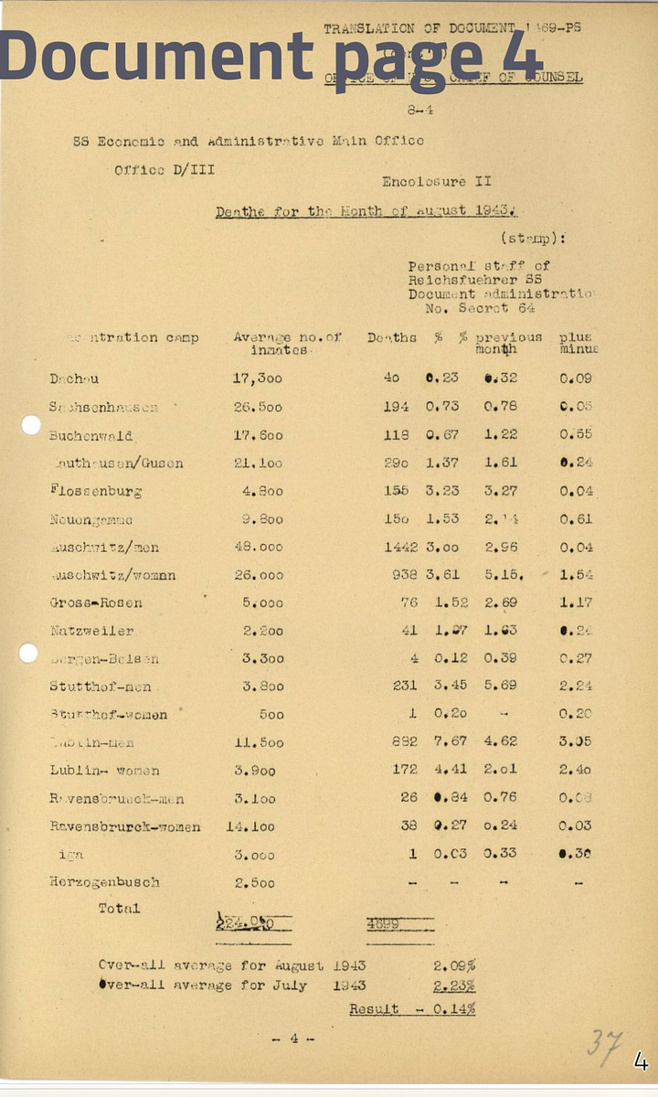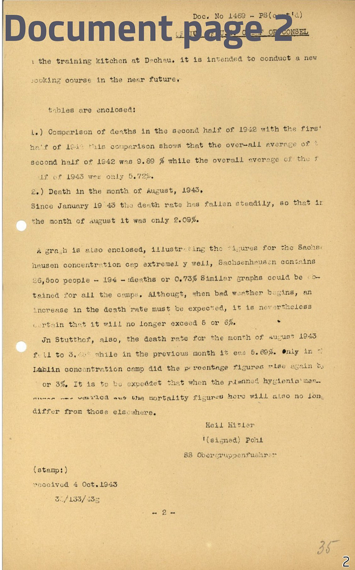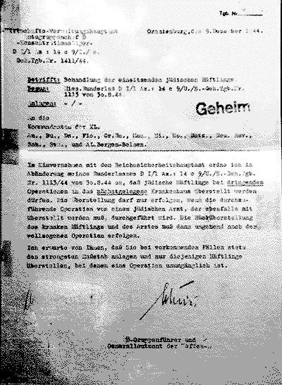 “With a death rate so high, you can never bring the number of inmates up to the level that the Reichsführer SS has ordered. The chief physicians in the camps must strive with all means at their disposal to ensure that the death rate in individual camps falls substantially. The best doctor in a concentration camp is not one who seeks to attract attention with inappropriate harshness, but one who maintains the labor capacity as high as possible with surveillance and rotation in individual workplaces. Camp medical officers have to attach more importance to monitoring inmates' food and to make proposals for im-provements to the camp commandants in agreement with the authorities. These must not, however, remain only on paper, but must be regularly checked by camp doctors. Camp doctors must also ensure that working conditions in indi-vidual workplaces are improved as much as possible. For this purpose, it is necessary that camp doctors check working conditions in person and on site. The Reichsführer SS has ordered that mortality absolutely must be reduced. For this reason, it is ordered as above, and each month a report must be sub-mitted to the head of Office D II on what measures have been taken. Starting February 1, 1943.”