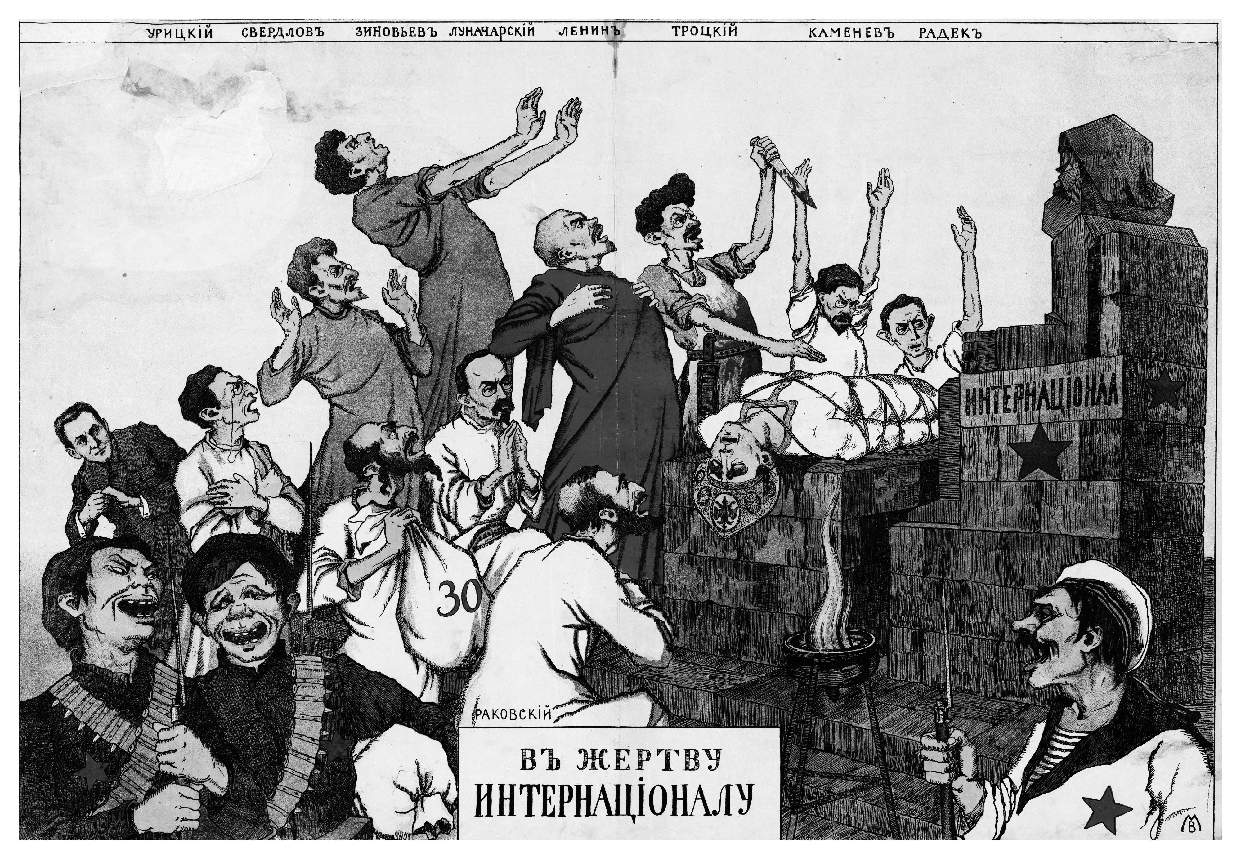 Above: Russian Civil war era depiction of Bolsheviks sacrificing a Russian man in a Rabbinical practice for International Jewry.