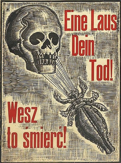 Above: German Concentration Camp poster warning against lices: “One lice can be your death!”, written in Polish too, since Poland housed the most amount of Jews and they only knew Polish.