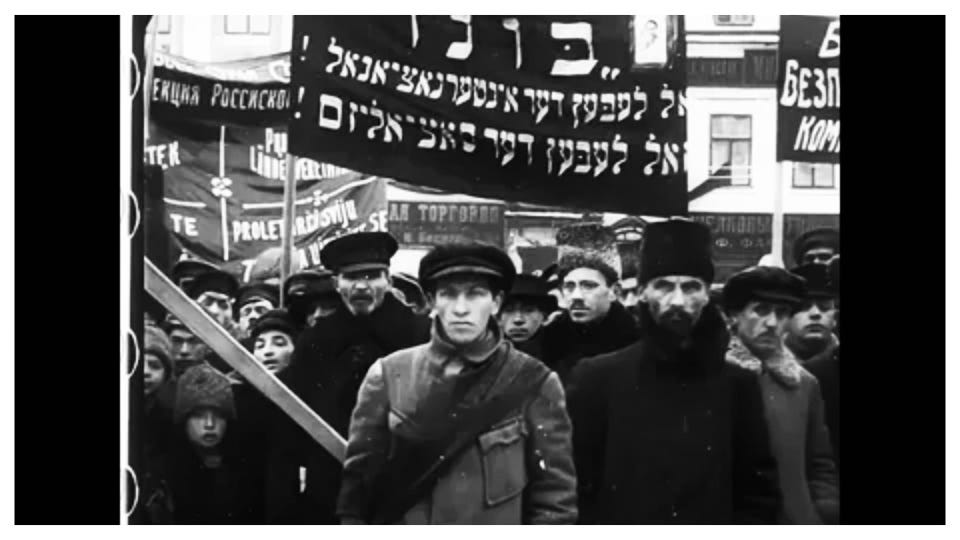Above: Jews with a banner in Hebrew “All power to the Soviets” in 1917 Russia.