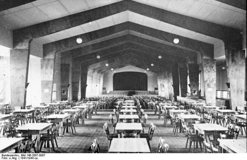 IG-Farbenwerke was connected to Auschwitz by rail, which allowed seamless transportation of workers from Auschwitz to the rubber factory. IG-Farbenwerke also held excellent facilities for the Jewish workers there; the dining or lunch hall at IG-Farbenwerke was designed this way: