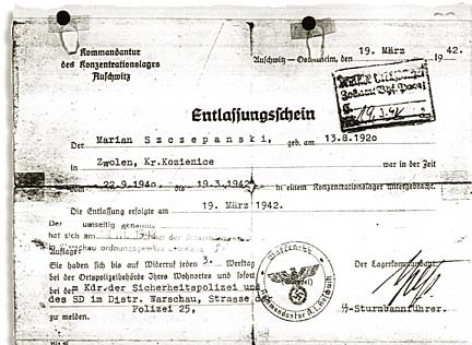 Above: Certificate of Discharge issued to an “Marian Szczepanski” to be dismissed from a concentration camp.