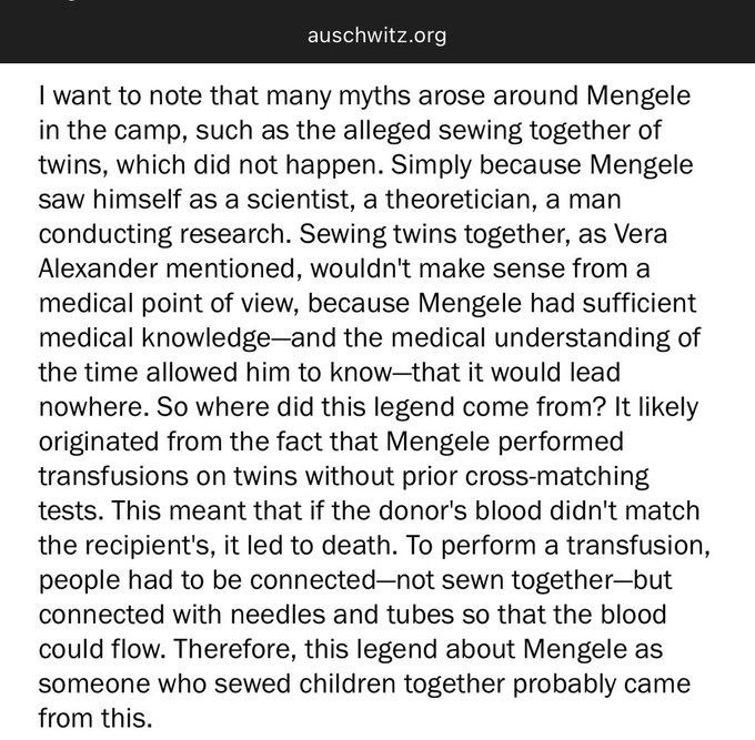 According to the sensationalist Anglo “historian” Mark Felton, Dr Mengele subjected Jews to cruel experiments involving “sewing two twins together” and “mutilating the faces of beautiful Jewish women” or “killing hundreds of Jewish children as a celebration for Yom Kippur”. It is a shame that people like him call themselves “historians”; they are mostly profiteers that want viewer engagement on YouTube with sensationalist history, as Auschwitz itself came out to contradict contemptuous Felton with: