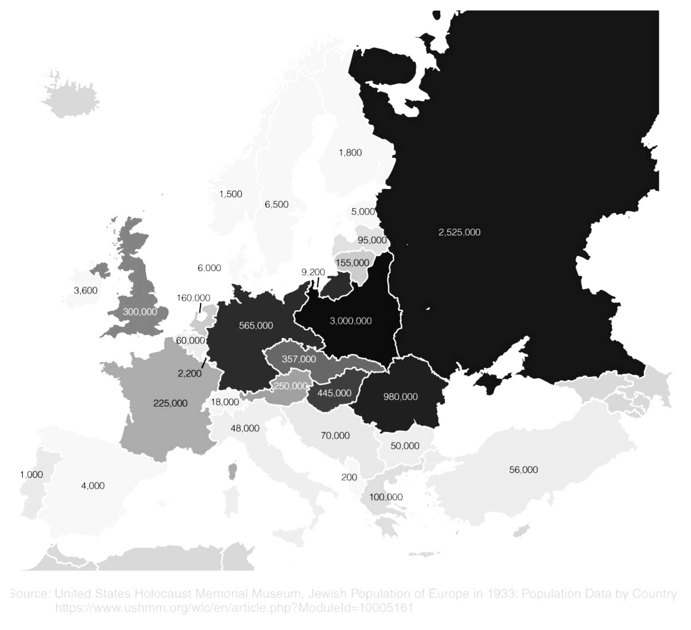 Above: Population of Jews in Europe before World War 2, According to USHMM.